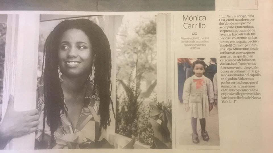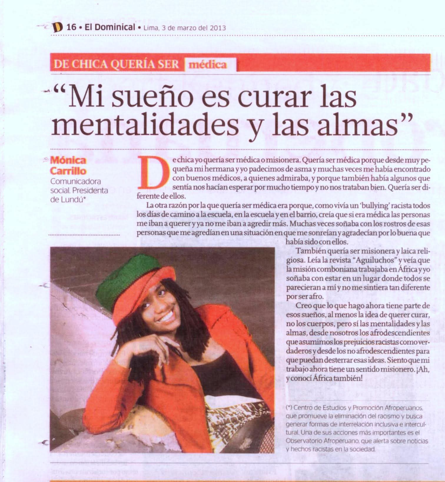 Periodista, poeta, escritora, defensora de los derechos humanos, feminista y, sobre todo, activista social y artista. Mónica Carrillo Zegarra la discriminación racial no es un chiste. La fundadora y directora de Lundu-Centro de Estudio y Promoción Afro Peruanos, lleva 15 años trabajando por el reconocimiento de los derechos de esta importante comunidad. Ha creado el Observatorio de Medios, que desde el 2008 a la fecha lleva analizando 12.000 ediciones impresos para detectar casos de discriminación racial. La data, disponible en Internet, es utilizada por universidades de Estados Unidos y Canadá en la formulación de investigaciones y tesis sobre este tema.
